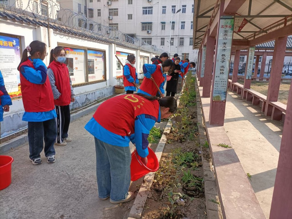 ~ 校团委利用国旗下讲话和校园广播,向全校师生发出《爱绿护绿,从我做起》倡议书,让同学们在了解植树节的来历以及植树的意义的同时,争做绿化环保小卫士,爱护一草一木。花园中,志愿者们满腔热情积极参与,亲手种植了一颗颗幼苗,并为园中的树苗花草松土、浇水,修剪枝叶,铲除周边杂草,细心呵护树苗花草成长,大家不辞辛苦,分工有序,团队合作意识较强。微风中,红马甲在阳光的映照下更加鲜艳夺目,与校园的片片绿色形成了一幅幅优美的画卷。活动结束后,大家看着自己的劳动成果,脸上露出了欣慰地笑容。
