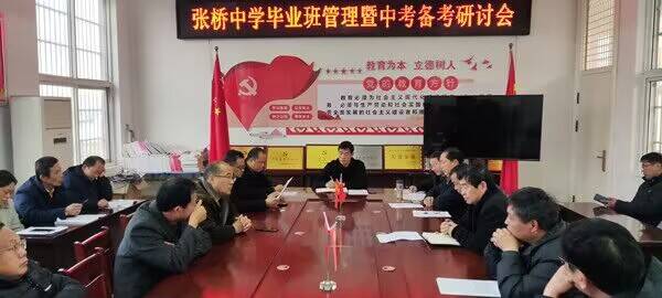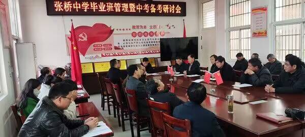 ~ 3月12日,定远县张桥中学在党员活动室召开毕业班管理暨中考备考研讨会。校长室成员、毕业班管理领导小组成员、九年级班主任及科任教师、八年级地理、生物教师悉数参加了此次会议,会议由分管教学的副校长郭保胜主持。