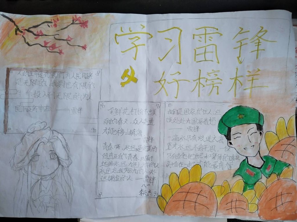 以班级为单位,每班围绕“学雷锋”为主题,自行设计黑板报、手抄报,要求设计新颖、内容充实、书写规范,营造的学习氛围浓厚,团委组织评选小组评选出“学雷锋模范班”,以此促进学习的成效。