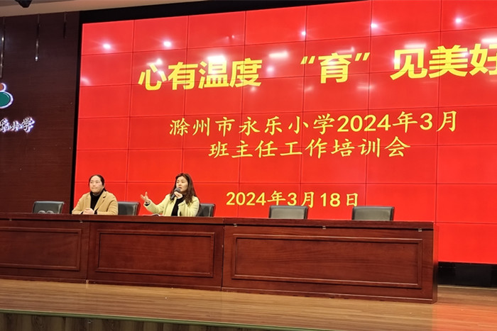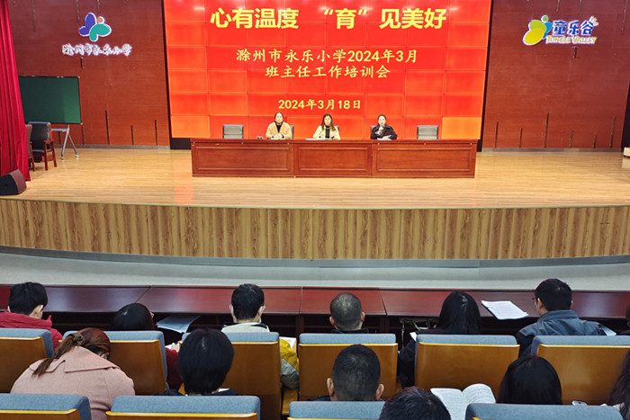 ~ 春风化雨共成长,弦歌不辍育芳华。为全面提升班主任工作水平,强化学校常规管理,提高育人工作实效,严格落实“双减”政策,3月18日,滁州市永乐小学在“童乐谷”剧场召开了班主任工作培训会。培训会由副校长张莉莉主持,全体教师参加。