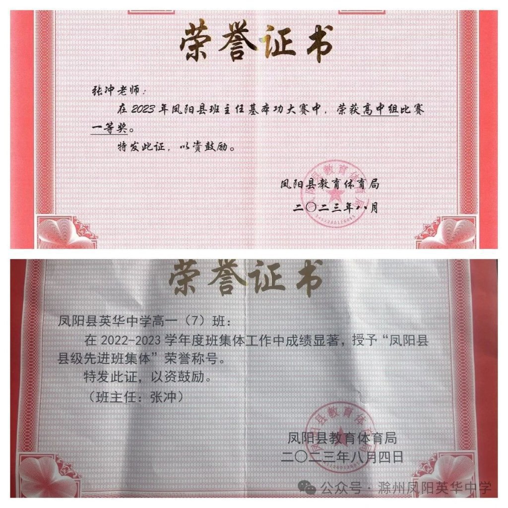 ~ 张冲,中共党员,滁州市凤阳英华中学高中部德育主任、高二2207班班主任。毕业于安徽师范大学化学系,从教20年来,始终保持勤勤恳恳、任劳任怨的工作态度,始终把学生的成长放在心间,始终把教育教学事业作为自己的第一责任使命。先后多次荣获市级表彰,所带班级多次荣获县、市级优秀班集体及市级高考优胜班级荣誉称号。