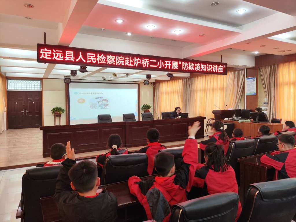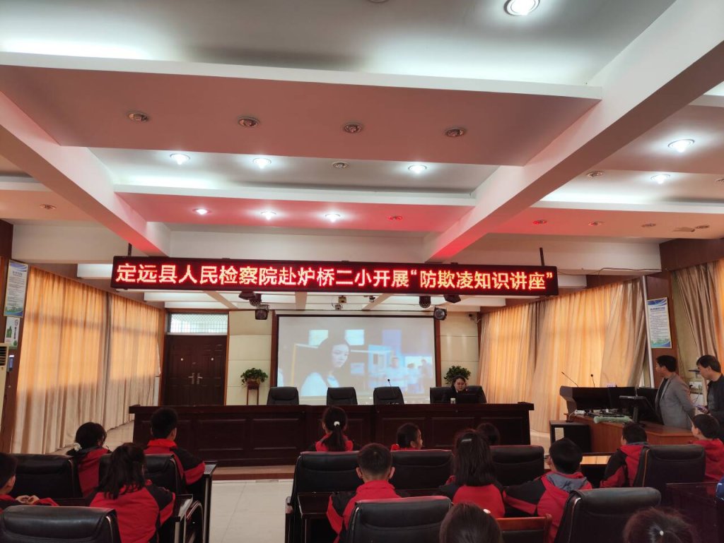 ~ 为了加强学生的法治意识,预防校园欺凌事件的发生,3月21日,应炉桥镇第二小学教育集团邀请,定远县人民检察院第五检察部主任周欢欢、干警潘莹莹走进炉桥二小,开展了一场主题为“拒绝校园欺凌,共建和谐校园”的安全教育。