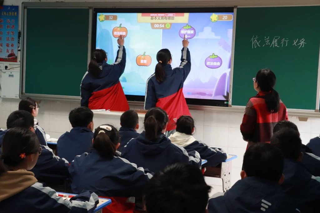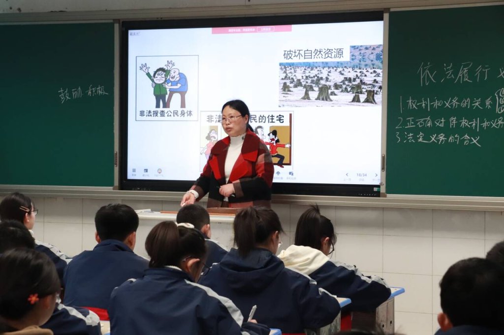 ~ 林艳春老师这节课的主题是“依法履行义务”。先由两位学生通过玩游戏的方式导入文本,激发了孩子的求知欲和学习兴趣,也令所有在场听课的老师耳目一新,赞不绝口。在新课的讲授过程中能够以案说法,通过漫画和视频让学生直观的感受到权利和义务的关系。并结合生活中的事例,开展小组讨论,同学们各抒己见,课堂氛围融洽,学生在交流讨论中加深了对理论知识的理解。