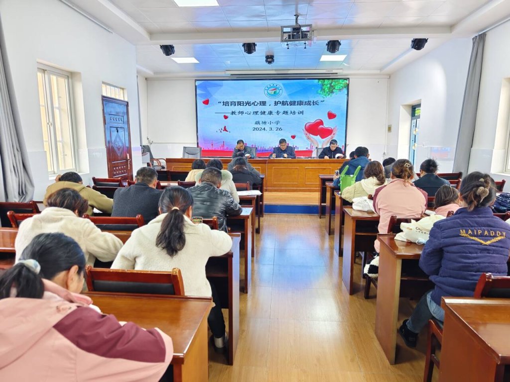 ~ 3月26日下午,定远县藕塘小学组织开展教师心理健康专题培训,旨在提升教师的心理素质,促进学生健康成长。本次活动以“培育阳光心理,护航健康成长”为主题,全体教师参加培训活动,校长罗培齐主持并作专题培训。