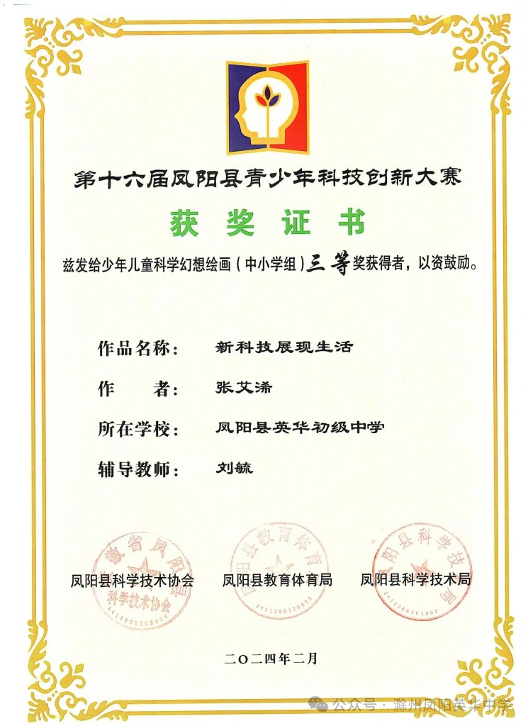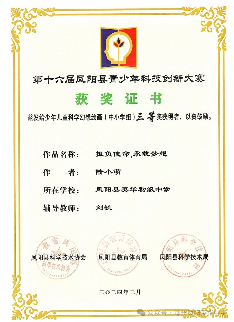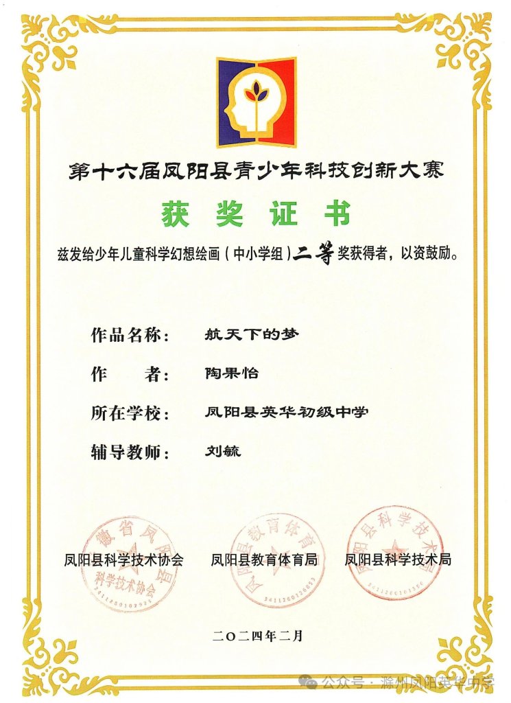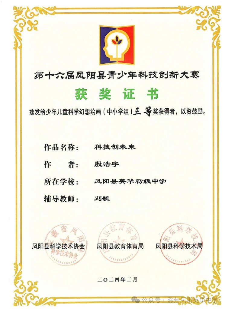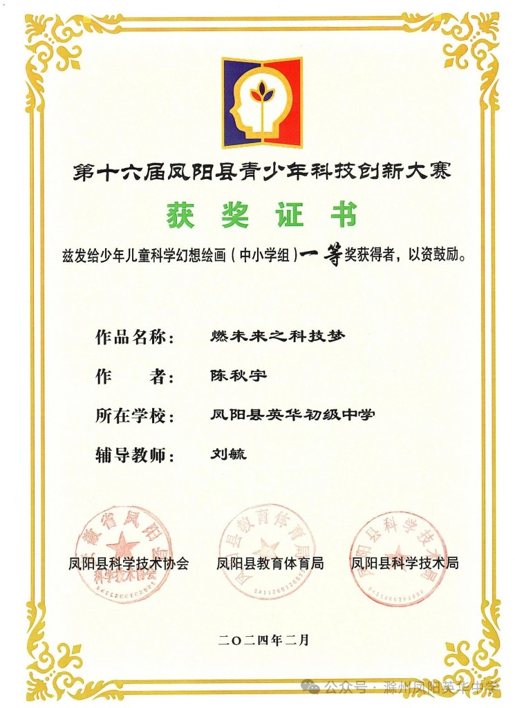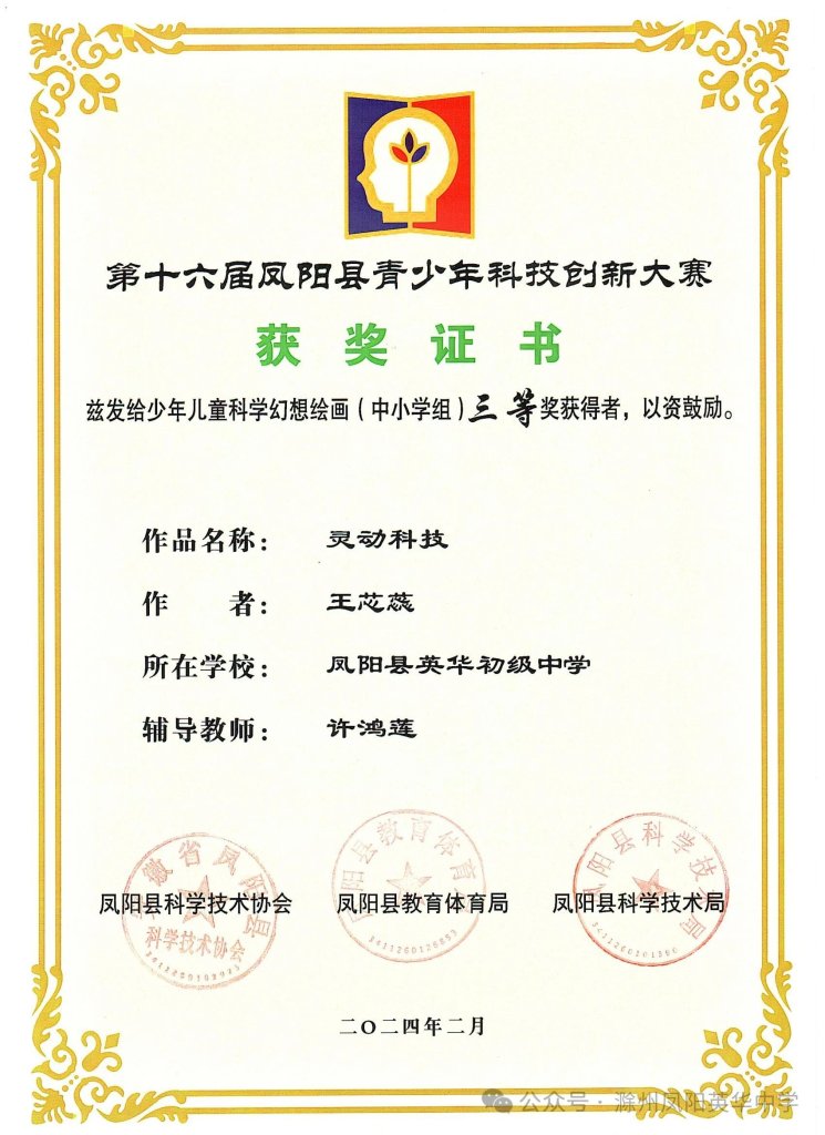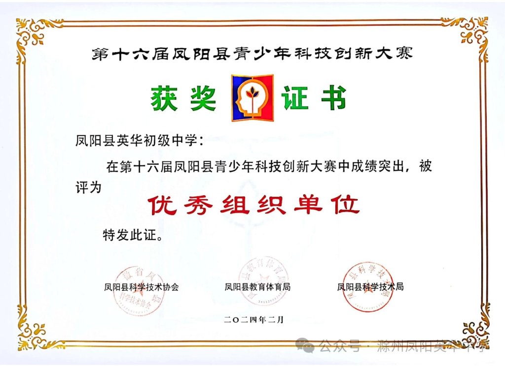 ~ 春风拂面,喜讯频传!第十六届凤阳县青少年科技创新大赛评选结果揭晓,凤阳英华中学荣获第十六届凤阳县青少年科技创新大赛优秀组织单位奖项,同时,六名学子表现出色,从众多参赛者中脱颖而出,在此向所有获奖学生和指导老师表示衷心的祝贺。