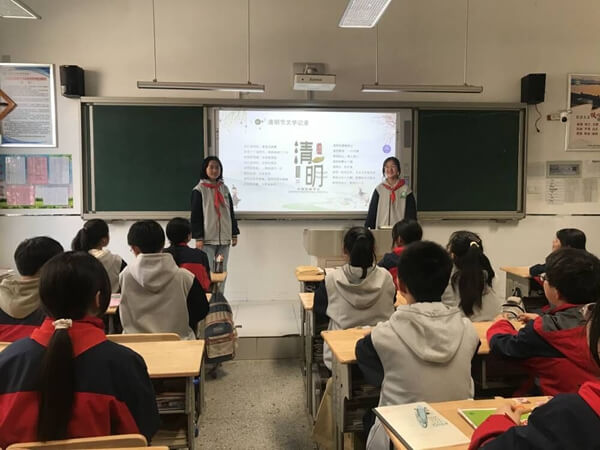 ~ 利用国旗下讲话,该校党支部书记、校长张书清教育学生认真学习革命先烈的英雄事迹和崇高精神,激发全体学生对革命先烈深切的怀念和无限的哀思。大队辅导员刘晓燕老师走进课堂,为同学们上清明节主题活动课。让队员们分别讲解了清明节的起源、风俗习惯和传统食物,队员们还通过对诗的方式讲述了许多清明节的文学作品。最后队员们集体宣誓要文明祭祀、缅怀先烈。