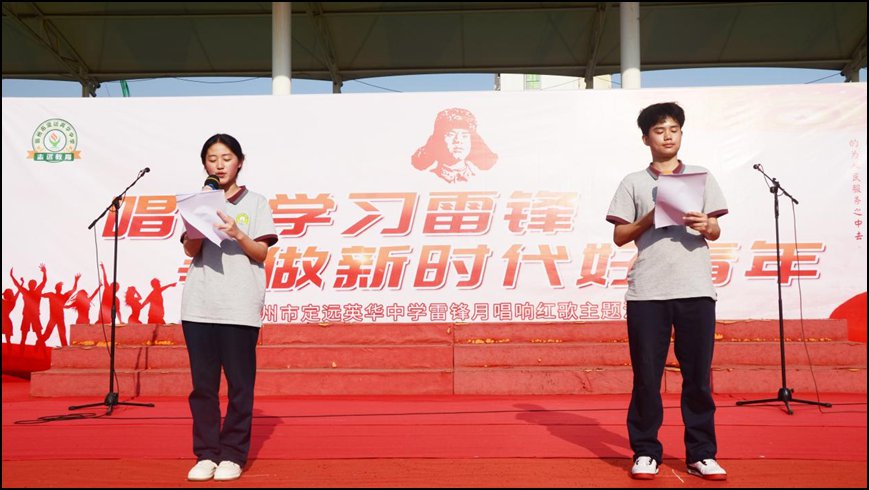 ~ 岁月如歌,春光正暖。为宣传雷锋同志的光辉事迹,深刻把握雷锋精神的时代内涵,滁州市定远英华中学高中部推动了“学雷锋月”活动深入开展,丰富我校文化建设的同时,也提升学生的文明素质和奉献意识。3月30日下午4点,高一高二年级全体师生齐聚田径场,举办了“雷锋月”唱响红歌主题活动,德育处主任秦邦从热情洋溢地宣布活动开始。