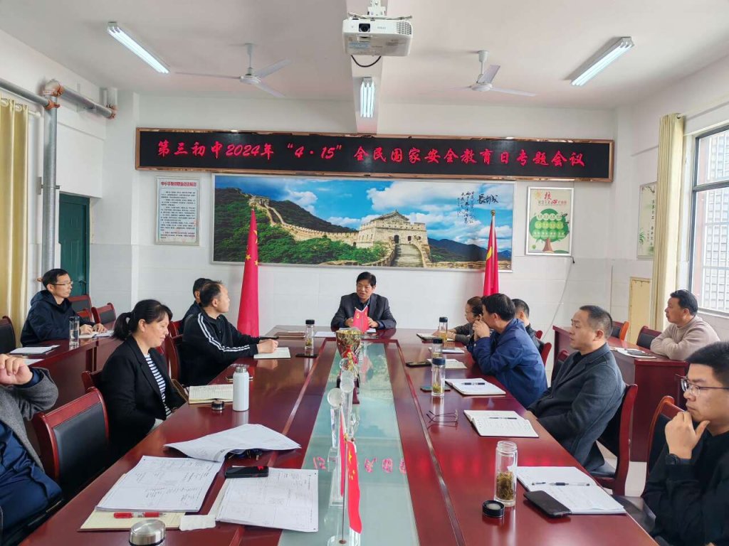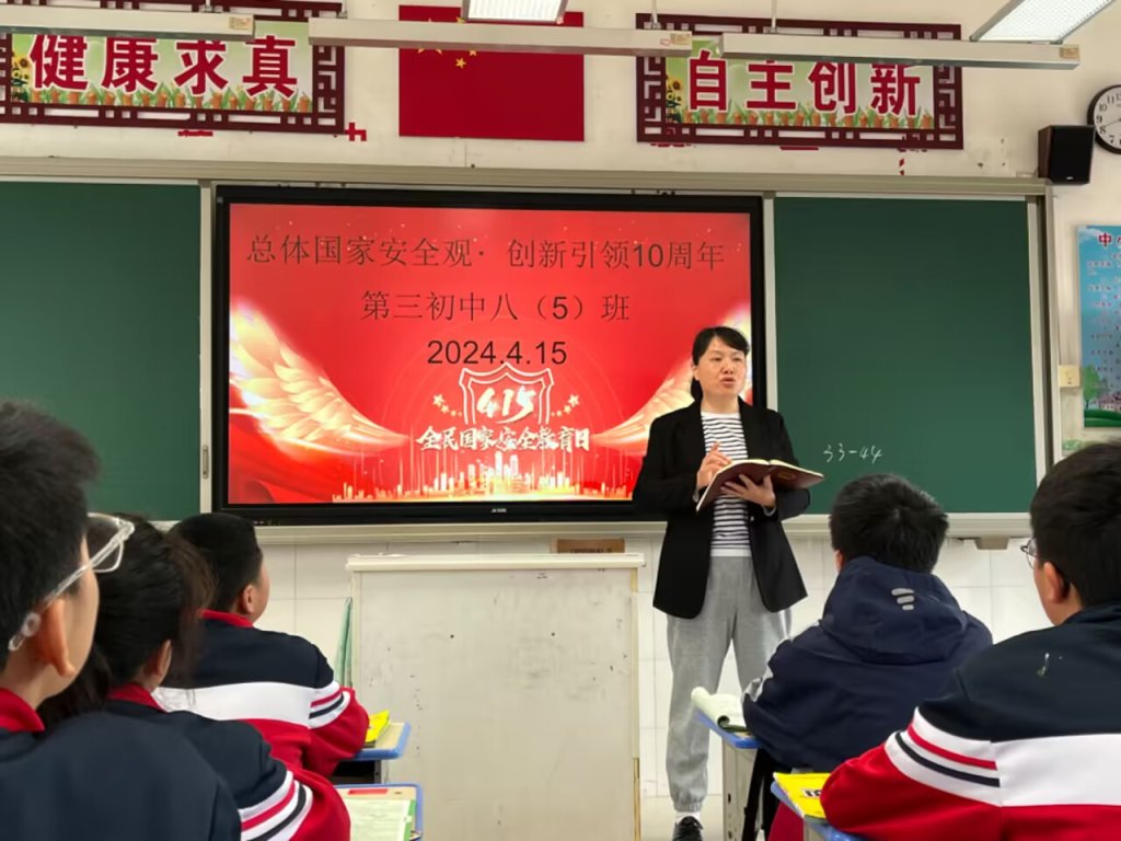 ~ 为了落实此项工作,第三初中领导班子召开了“4·15”国家安全教育宣传日专题会议,强调各部门、各年级严格按照活动要求,在校园内广泛开展主题宣传教育,营造全民共筑国家安全人民防线浓厚氛围。上午,学校举行了以国家安全教育为主题的升旗仪式。升旗仪式上,学生代表进行“安全教育”主题国旗下讲话,带领全校师生了解何为国家安全,什么是总体国家安全观,如何维护国家安全,以及日常生活中注意警惕危害国家安全的活动。各班围绕“总体国家安全观·创新引领10周年”主题开展了国家安全主题班会,让全体师生进一步明确每位公民都有维护国家安全的责任和义务,国家安全,人人有责。