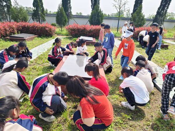 ~ 活动伊始,师生们齐聚王小庙无名烈士陵园,奏唱国歌,以庄严的仪式感开启研学之旅。随后,全体师生默哀,表达对革命先烈的无限敬意和缅怀之情。在诵读《少年中国说》环节,孩子们的声音铿锵有力,展现了新时代少年的风采和担当。接着,师生们围绕纪念碑一圈,瞻仰烈士们的丰碑,感受那段波澜壮阔的历史。而为无名墓碑除尘环节,不仅是对先烈的尊重,更是对历史的敬畏。最后,孩子们向先烈敬礼,用行动表达对英雄的崇敬和对国家的忠诚。此外,炉桥二小的师生们还参观中央第三次中原局会议旧址,让学生们近距离感受革命先辈的奋斗历程,了解革命历史,增强了国防意识。