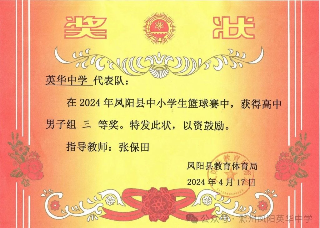 ~ 在刚刚结束的2024年凤阳县中小学篮球联赛中,学校初中篮球队首次组队参赛,面对强敌,毫不畏惧,获得全县第五名的优异成绩,积累了宝贵的比赛经验,高中篮球队获得团队第三名优异成绩。