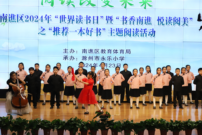 ~ 最美人间四月天,清风漫卷书香来。为大力弘扬中华传统文化,全面落实课程标准,深入推进课程改革,有效贯彻“双减”精神,持续拓展阅读资源,大力提升校园阅读品质,合力擦亮“书香南谯,悦读阅美”阅读品牌,根据《关于印发《关于加强南谯区中小学校课外阅读的实施方案(试行稿)》的通知》(南教体字(2021) 23号)精神。4月23日,南谯区2024年“世界读书日”暨“书香南谯,悦读阅美”之“推荐一本好书”主题阅读活动在滁州市永乐小学举行。南谯区委教体工委委员、区教体局副局长董雪芹,区教体局中小学教研中心负责人张文生等领导,南谯区第一督学责任区专职督学,全区各中小学校副校长、教导主任,部分学生代表和家长参加了此次活动。