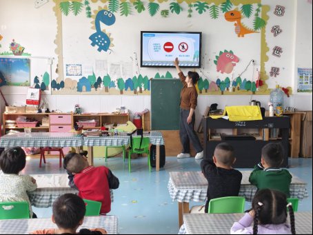 现场模拟前,老师在班级用PPT展示交示标识,通过老师的介绍,让幼儿认识简单的交通标志,通过提问、解答等方式,使幼儿对交通标志有了一个初步的的认知。