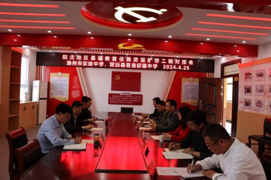 为深入推动皖北地区基础教育优质资源扩容提质,促进皖北地区新优质学校创建工作,加快滁州市实验中学与定远县青洛初中结对帮扶步伐,4月25日,滁州市教体局基教科科长薛姗姗带领滁州市实验中学党委书记、校长付俊、滁州市实验中学副校长倪晓虎等一行走进定远县青洛初中开展结对帮扶对接活动。