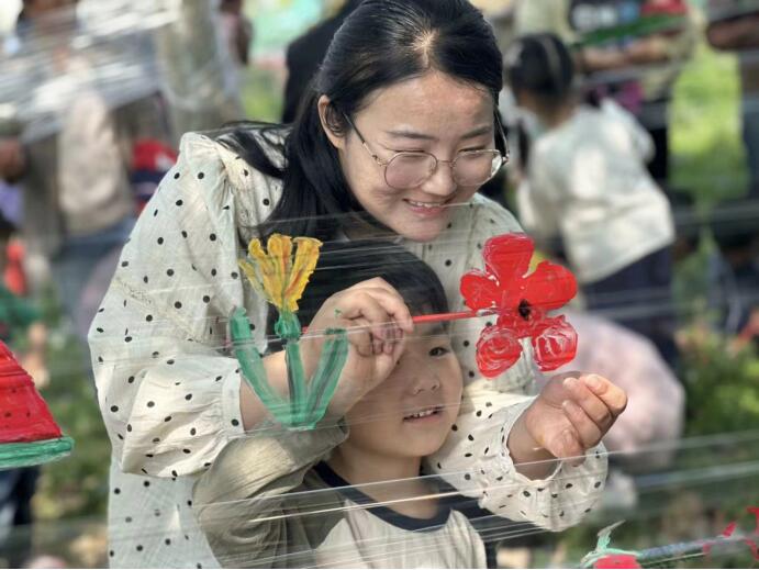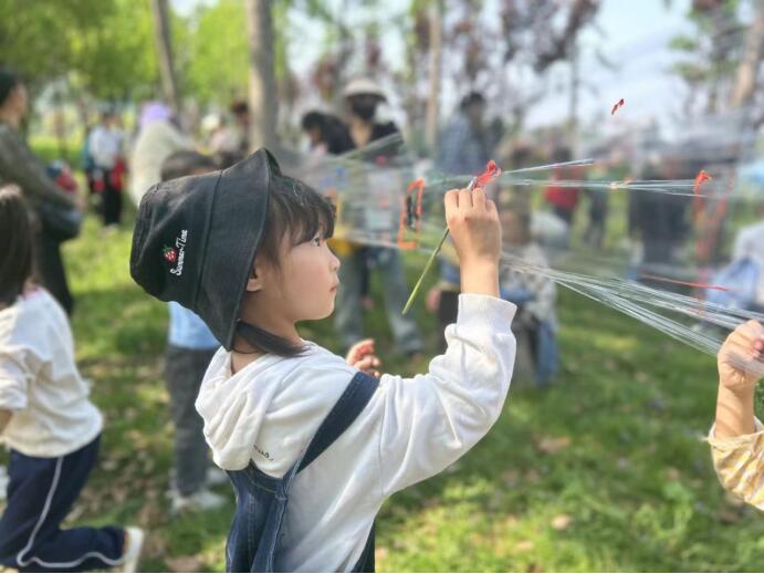 ~ 活动分为亲子游戏和绘画两个部分。孩子们一出门便发现了春天的秘密,我们把春天装在图画里,把春天画在薄膜上,把春天镶嵌在风车中。