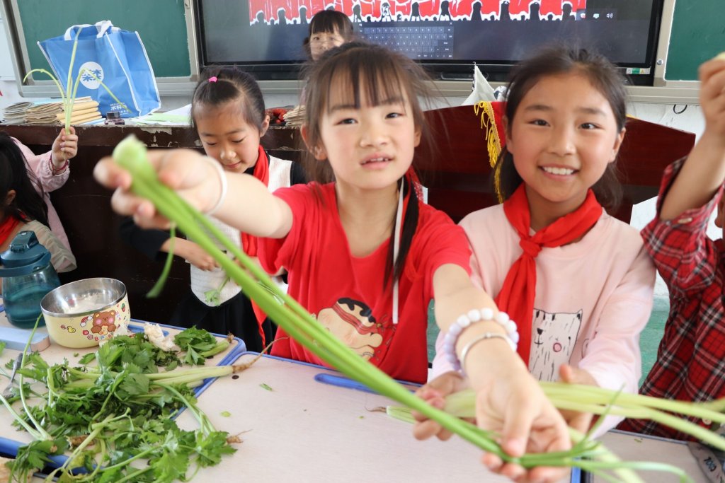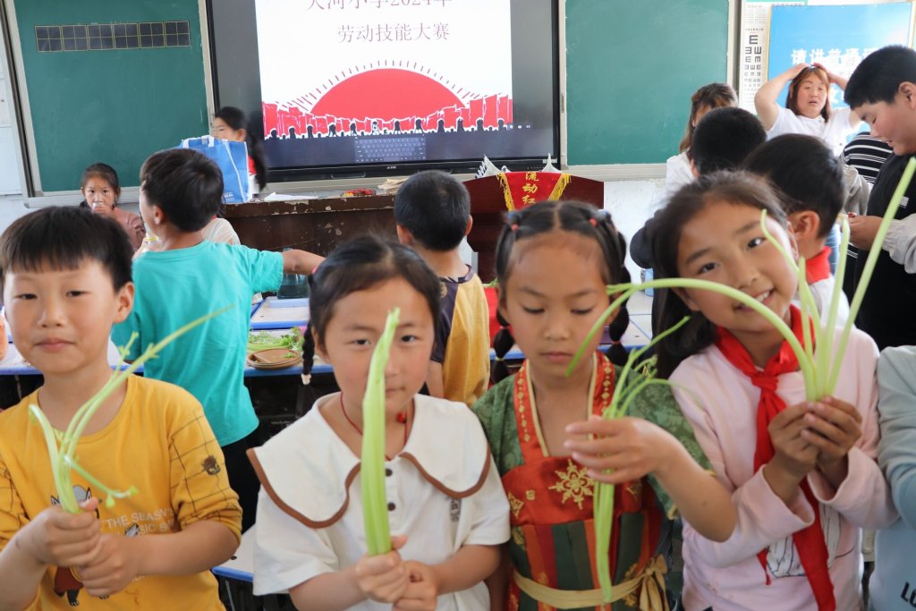 ~ 美食分享会后,学校以班级为单位召开劳动技能大赛。一二年级比赛摘芹菜,三四年级比赛剥蒜,五六年级比赛削土豆。只需在规定时间内完成比赛皆可获得劳动勋章,学生参与热情高涨,获得奖章后喜笑颜开。