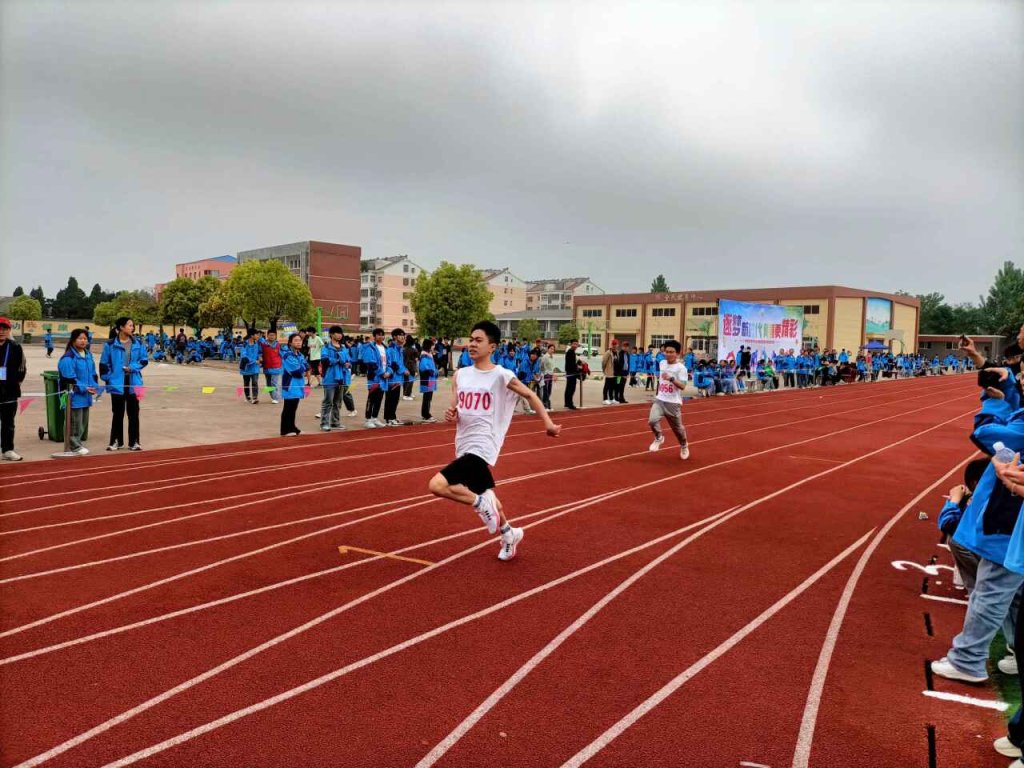 ~ 运动场上,彩旗飘扬,伴着运动会进行曲,各班在国旗队、校旗队的引领下,迈着坚定的步伐,整齐有序入场,一声声口号铿锵有力、斗志昂扬。全体师生以蓬勃向上的英姿迎接本次运动会的开幕。本次运动会设有男子1000米、女子800米长跑,100米、200米短跑,教师组、学生组4×100米接力赛,跳高、跳远、铅球六大项目。运动健儿们个个精神抖擞、驰骋赛场,奋力拼搏,充分展现出个人的顽强斗志。同学们热情高涨,助威声、欢呼声此起彼伏。裁判员们公平公正评判,为赛事护航。奋斗的青春最美丽,每个运动健儿都用拼搏的精神书写了最靓丽的青春风采,用坚强的意志诠释了新时代学子的责任与担当。逐梦新时代,青春更精彩。本次运动会在同学们的欢呼声中圆满落下帷幕。