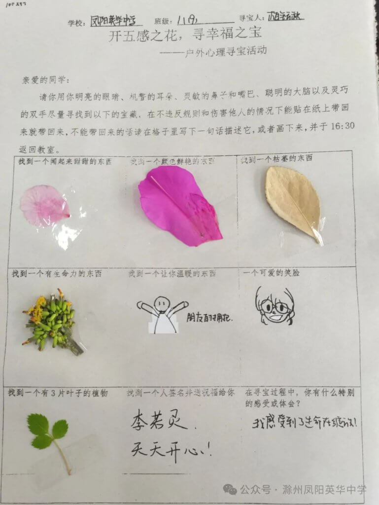 ~ 爱是人类的情感本能,是一种生理和心理的驱动力。对自己拥有的事物的欣赏、快乐、积极主动的体验能让我们身心愉悦,体验到爱的感觉。为丰富同学们的课余生活,提高同学之间互动的乐趣,培养同学们积极乐观的心态,发现身边隐藏的小美好,4月1日至4月30日,滁州凤阳英华中学组织开展了“开五感之花,寻幸福之宝”为主题的户外心理寻宝活动,以培养同学们发现美的能力。