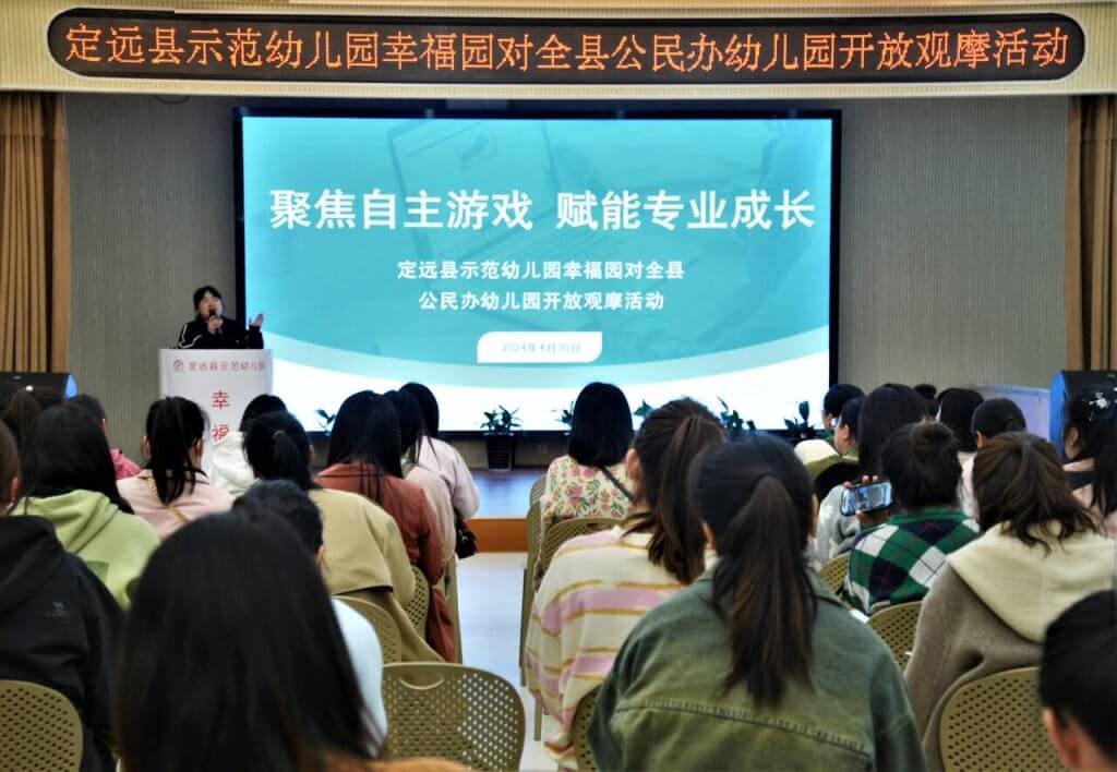 ~ 为进一步贯彻落实教育部《3-6岁儿童学习与发展指南》精神,切实推动幼儿园游戏活动的广泛、深入开展,提升教师观察、指导幼儿游戏的能力和水平,2024年4月30日上午,定远县示范幼儿园幸福园以“聚焦自主游戏 赋能专业成长”为主题,对全县公民办幼儿园开放观摩活动,定远县教育体育局教研室教研员李秀娟、定远县示范幼儿园园长金俊以及全县公民办幼儿园园长、骨干青年教师共一百多人参加活动。