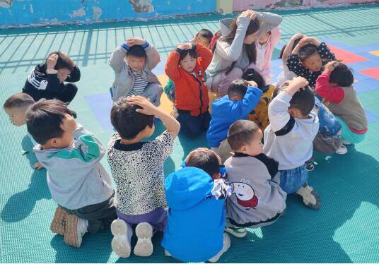 ~ 随着第二声警报响起,老师迅速组织幼儿弯腰低身,利用双手或枕头保护头部和颈部,沿着预定安全路线快速、有序地疏散到室外安全空旷场地。到达安全地点后,各班教师引导幼儿立即原地蹲下,护住头部。