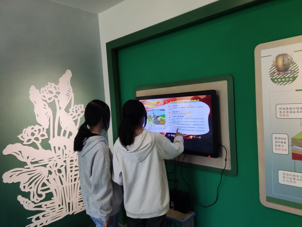 ~ 在地震馆内,同学们怀着强烈的求知欲和好奇心,边参观边听老师的讲解,依次参观了各个展区。深入了解了历史上的大震、地震的成因、地震的危害以及防御措施等重要知识。在“地震——群灾之首”展区,他们在地图上认真寻找家乡所在的位置,感慨自己正居住在大的地震带上;在地震演示模型前,他们直观地感受到了地震的成因及巨大的破坏力。孩子们还通过人机互动,了解了更多的地震知识,进一步巩固了所学内容。