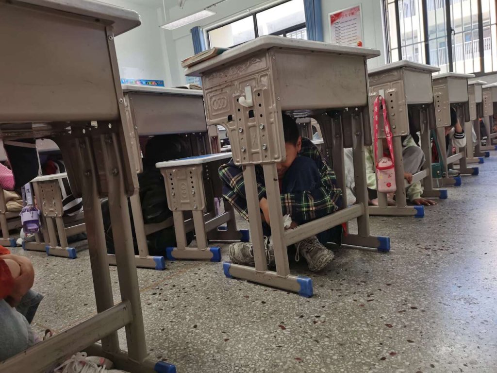~ 伴随着第一声警报响起,防震减灾演练正式开始。任课教师立刻停止各项教学活动,组织学生双手护住头部,蜷缩身体,利用书包、课桌等进行紧急室内避险,等待指示,为安全疏散做好准备。
