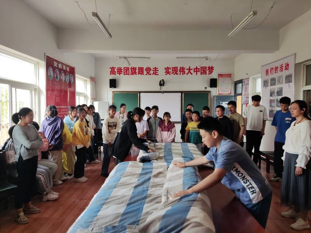 ~ 5月10日,学校举办了寄宿生叠被子竞赛,同学们在比赛中展现出熟练的劳动技能和积极向上的精神风貌。