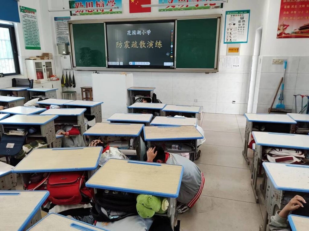 ~ 学校通过广播发出预警,班主任老师迅速指挥学生蹲下、弯曲身体,利用课桌等进行紧急室内避险,然后迅速逃离到指定场所,班主任及时清点人数,整个疏散演练过程井然有序,安全规范。