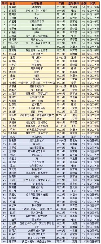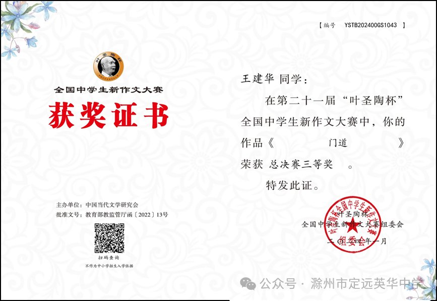 ~ 近日,第二十一届“叶圣陶杯”全国中学生新作文大赛高一高二组初赛结果揭晓,滁州市定远英华中学高中学子再获佳绩,共66名学生获得省级奖项:一等奖13人,二等奖23人,三等奖30人。其中高一(3)班俞欣然凭借《梦中锦,心中“豫”》、高一(3)班陈璐雅凭借《活木》、高二(1)班王金伟凭借《墨韵》、高二(9)班何嘉诚凭借《戏曲情缘》入围国家级现场总决赛。