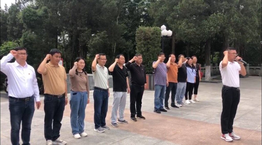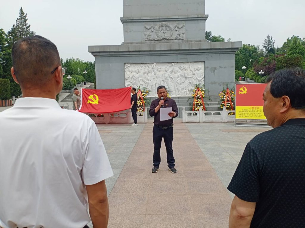~ 党员们来到金寨红军广场,瞻仰了革命烈士纪念塔,肃立默哀,敬献花篮,向革命烈士表达深切缅怀和崇高敬意。在鲜红的党旗面前,党支部副书记杜海军领誓,全体党员重温了入党誓词。铿锵的话语,坚定的承诺,荡涤着每一位党员的心灵,更加坚定了他们为共产主义事业奋斗终身的信心和决心。宣誓后,党支部书记沈祖辉带领全体党员学习了中国共产党纪律处分条例。