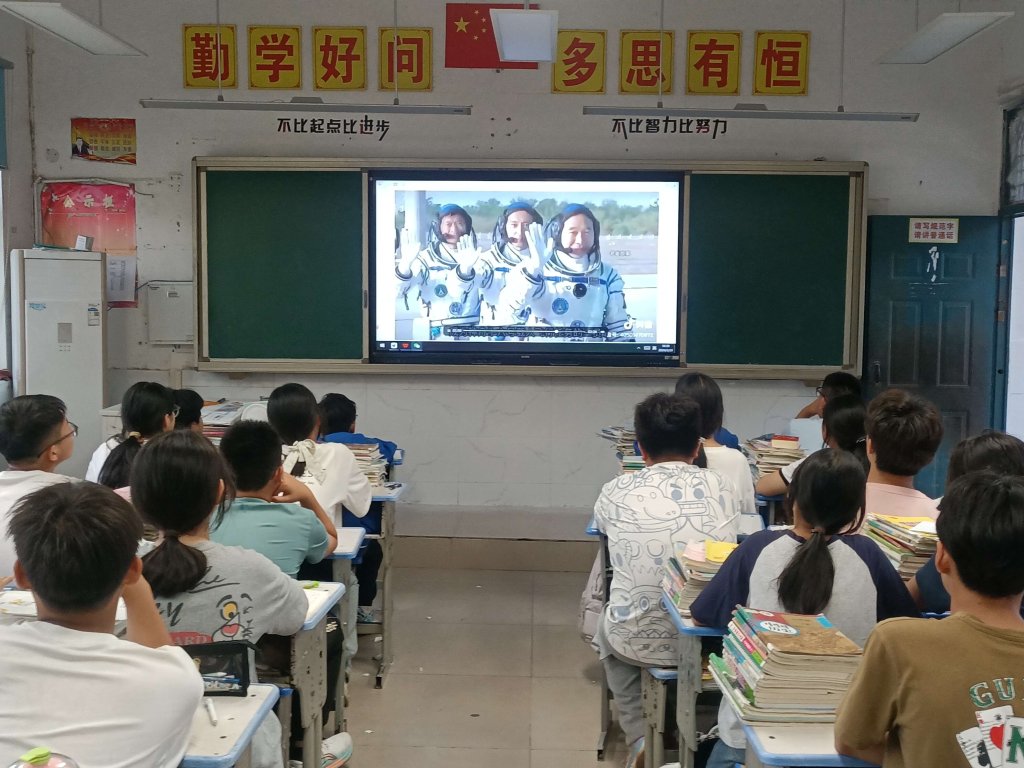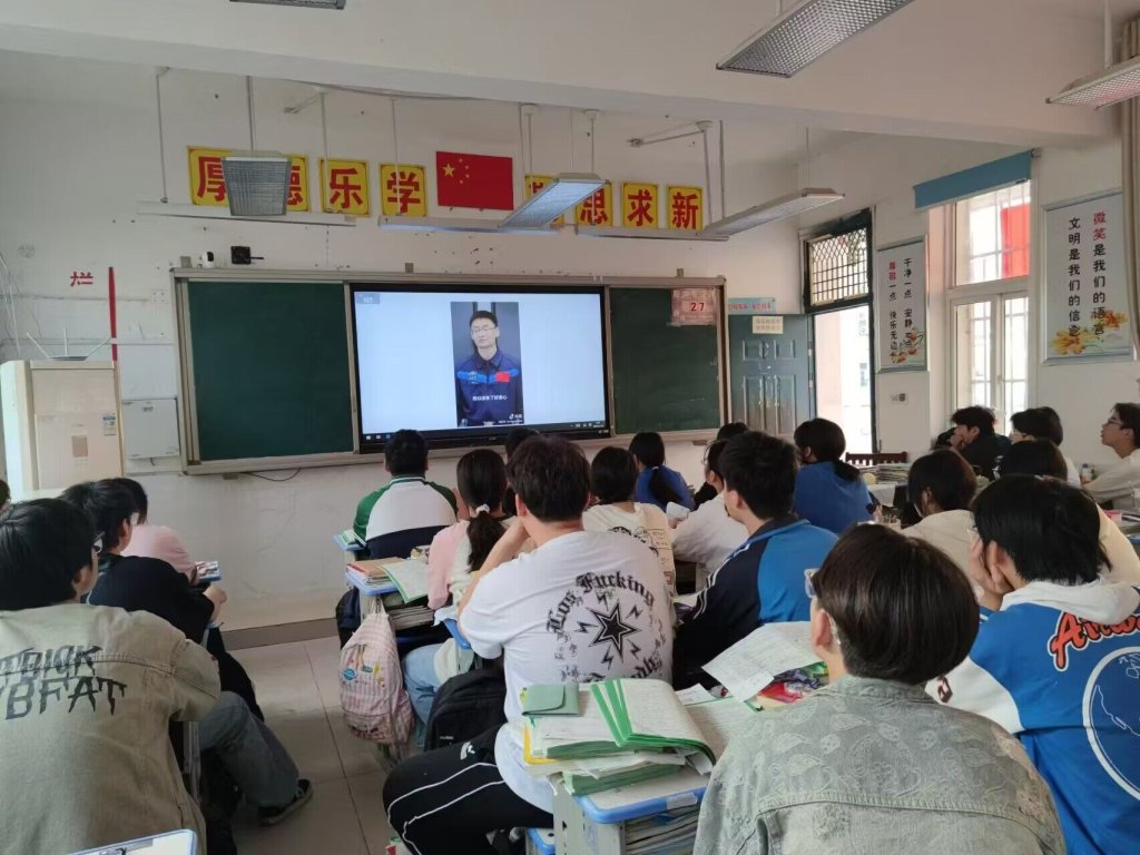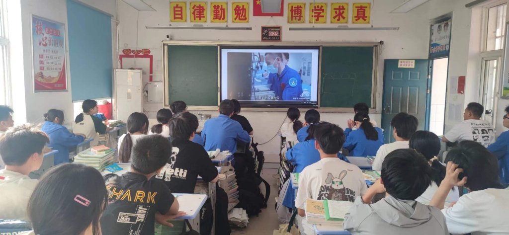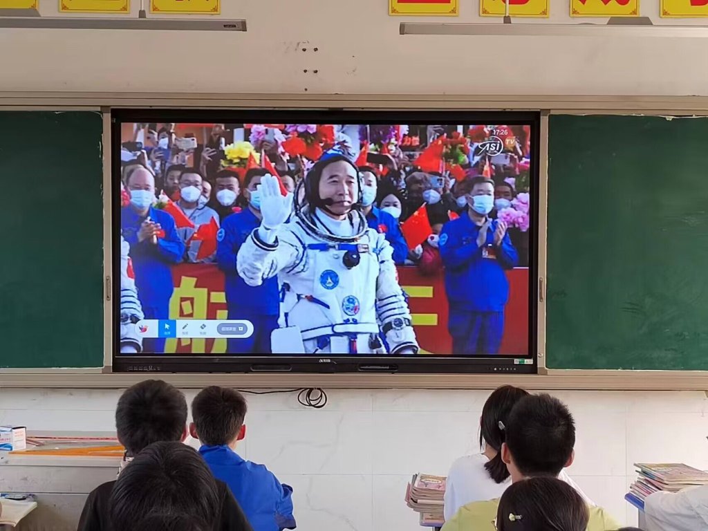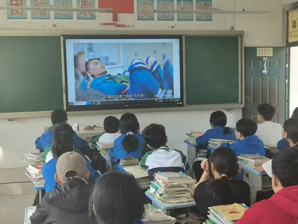 ~ 在主题班会活动中,各班主任以班会的形式向学生们讲解了中国航天发展的历史和一代又一代航天人在航天精神的感召下,演绎出了一个个催人奋进的感人故事;班会上,各班级组织学生收看了央视新闻频道直播回放,再次重温神舟十六号飞天和返回这一伟大时刻。学校通过国旗下讲话,向全体师生讲述了三位航天员“追梦星辰大海,英雄为国出征”的感人故事,点燃热血青春,铸就斑斓理想,增强报国之志。学校团委利用电子屏多次滚动播放向神舟十六号航天员学习的宣传标语。新颖的宣传教育形式,吸引了同学们的“眼球”,同学们在课间休息时间不时驻足观看,并从中受到良好的爱国主义教育,从而坚定理想信念。