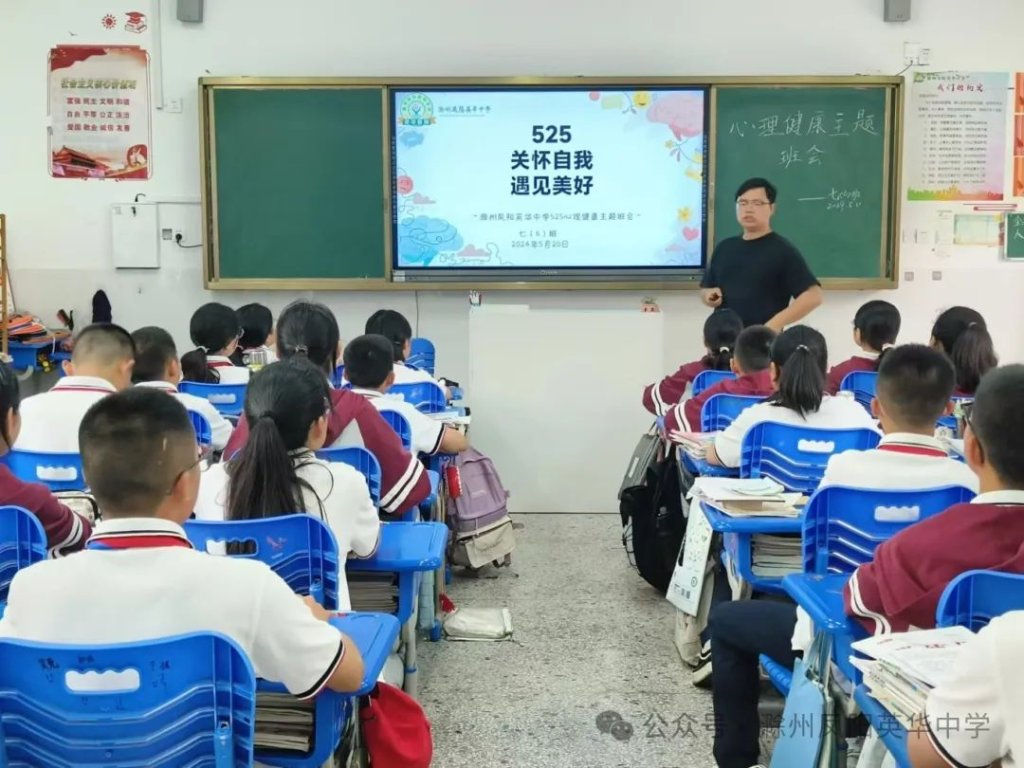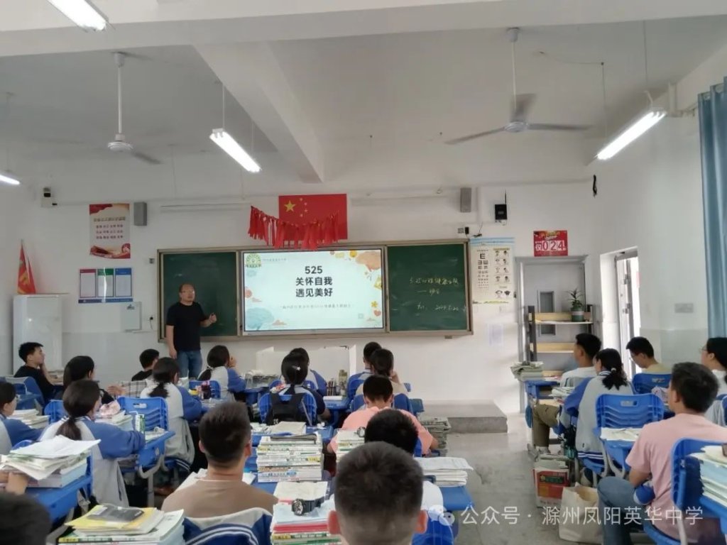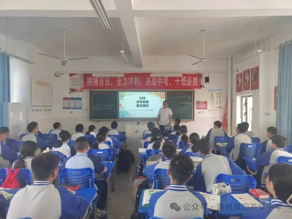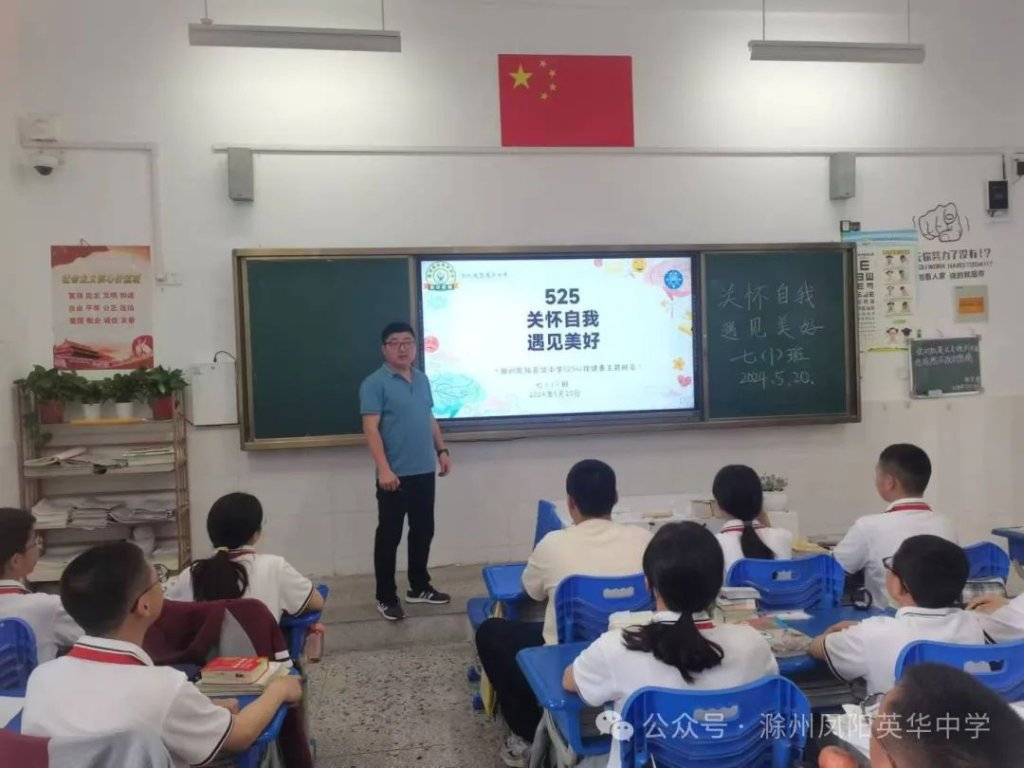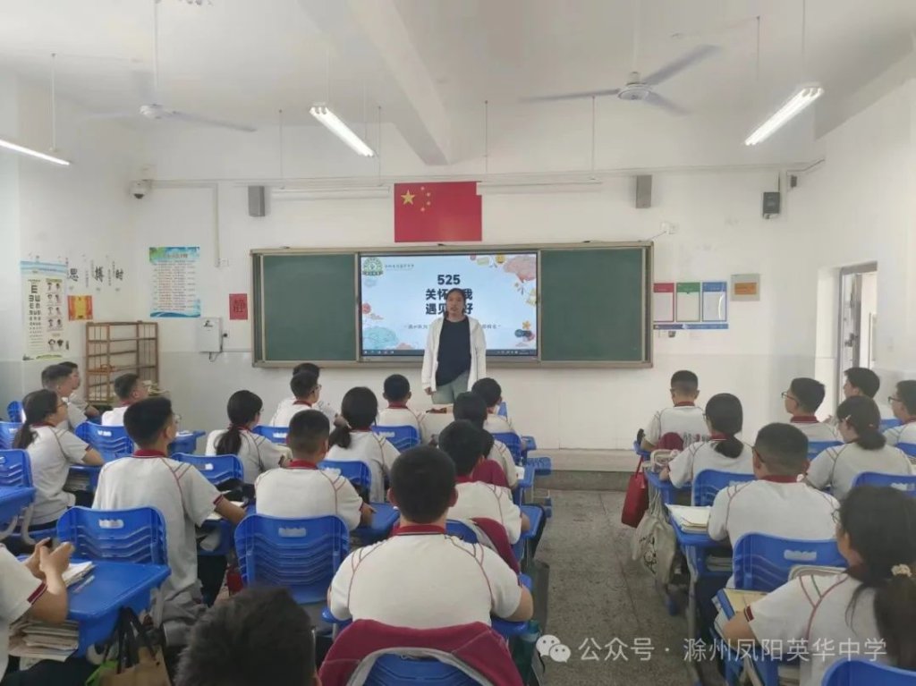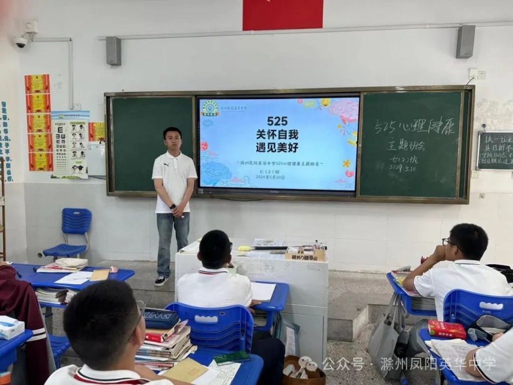 ~ 近日,教育部印发《关于开展首个全国学生心理健康宣传教育月活动的通知》,决定在2024年5月以“全社会都行动起来,共促学生心理健康”为主题开展首个宣传教育月活动。旨在通过形式多样的宣传教育活动,营造积极关心关注、支持参与学生心理健康教育的良好社会氛围,提升师生和家长心理健康知识水平和素养,推动学生心理健康工作提质增效,促进学生身心健康发展。为了全面落实五育并举促进心理健康理念,开展富有针对性的心理健康教育,5月20日,滁州凤阳英华中学召开心理健康主题班会。