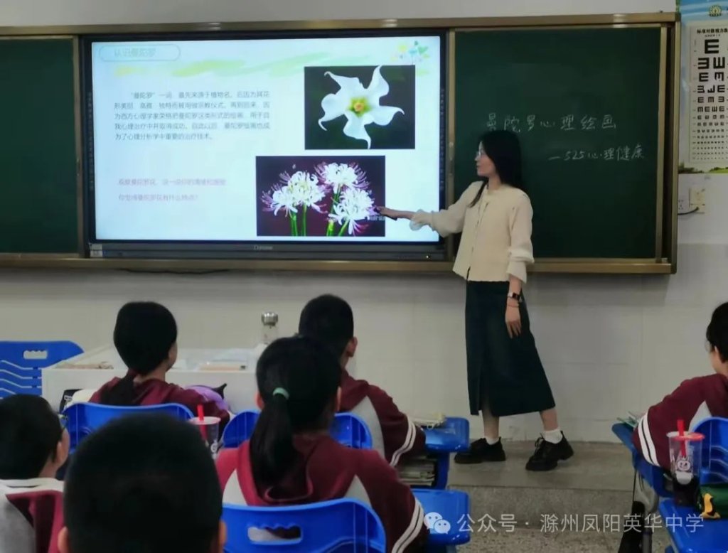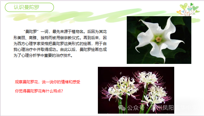 ~ 课堂上,心理老师王静向同学们介绍曼陀罗花,并帮助同学们体会自己的情绪感受,同时帮助同学们了解曼陀罗绘画的来历以及在心理治疗上的作用。