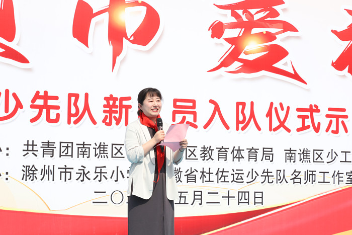 ~ 为继承和发扬少先队的光荣传统,培养少先队员积极进取的精神,增强少先队员光荣感和使命感,5月24日,“红领巾爱祖国”为主题的南谯区少先队新队员入队仪式示范活动在滁州市永乐小学隆重举办。共青团南谯区委书记徐迟,南谯区教体工委委员、区青少年活动中心主任戚家喜,南谯区少先队总辅导员杜佐运也来到活动现场,共同参与了本次活动。