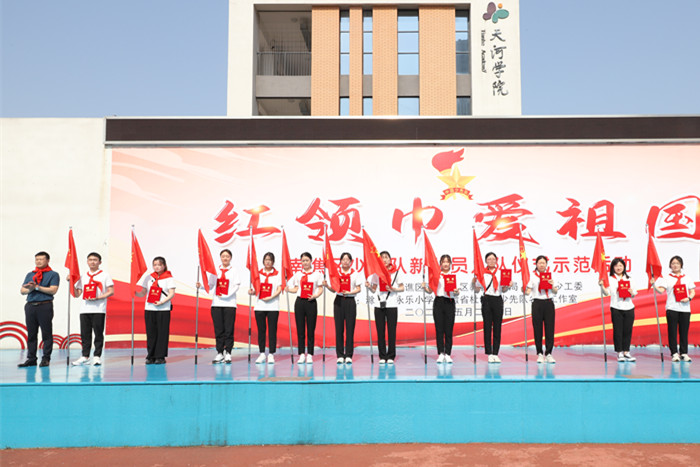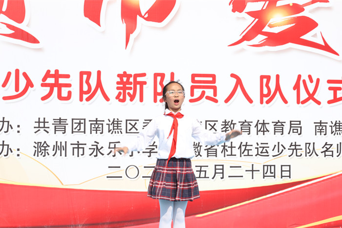 ~ 旗帜引领方向,旗帜凝聚力量。入队仪式在雄壮有力的《出旗曲》中拉开了序幕,鲜红的队旗格外耀眼,旗手和护旗手步伐坚定,气宇轩昂。首先,滁州市永乐小学党总支书记姚杰发表了热情洋溢的讲话,对新入队少先队员们表示热烈的祝贺。接着,唱队歌 、宣读新队员名单。