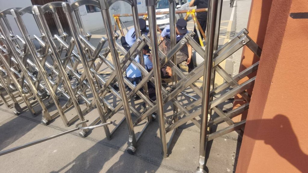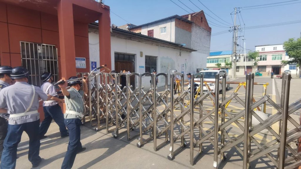 ~ 演练中,现场模拟“歹徒”手持凶器要强行闯入校园的场景,该校安保人员快速反应并立即报警,极力协同配合派出所民警作战,最后成功将歹徒制服带离现场。