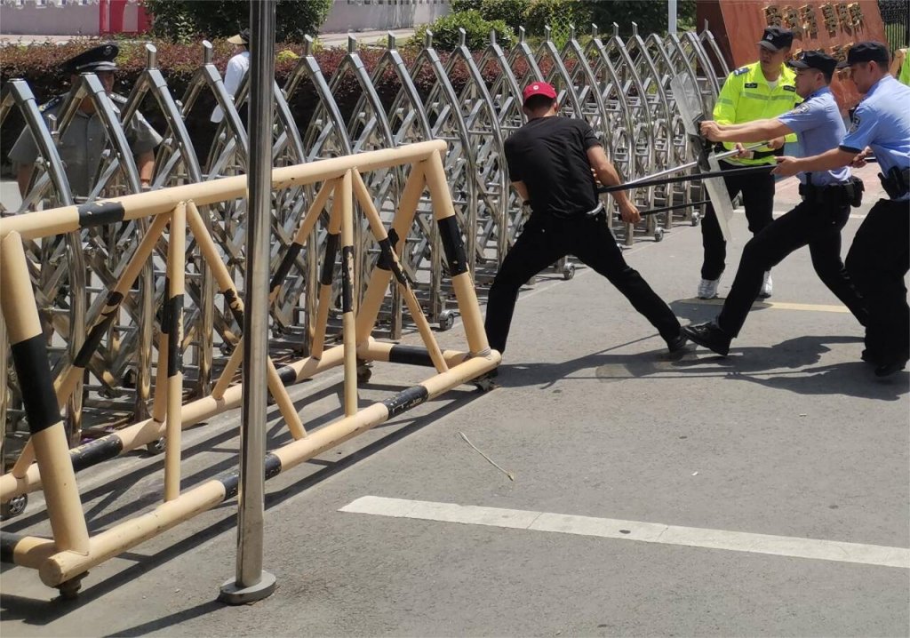 ~ 上午十时许,演练正式开始,一名“不明身份”的人员径直来到炉桥中学门岗前,未经安保人员询问便要持铁棍强行闯入校园。鉴于该男子强行入校,对我校师生构成严重安全威胁,安保人员立即封闭校门,持安保器械与该男子周旋,并及时按下“110一键报警电话”按钮,向警方报警,炉桥派出所的警务人员接警后,第一时间到达现场。随后,众人前后夹击,联手制服暴徒。暴徒被警方押解离开,警报解除,演练成功结束。
