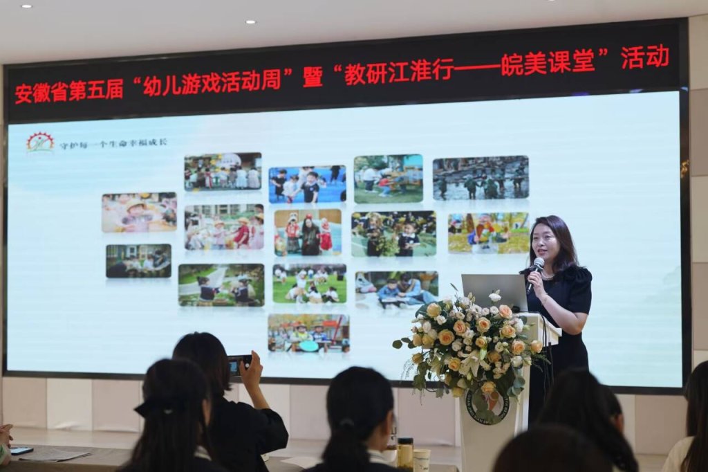 ~ 安徽省第四届教坛新星代姝伟老师现场展示了一节精彩的大班语言活动《咚咚咚,是谁啊》,以故事中爸爸的多重角色变换,有温度的与幼儿展开互动讨论,巧妙引导孩子们沉浸式感受爸爸深沉内敛的爱;定远县示范幼儿教育集团党支部书记金俊以“生命绽放的幸福院子”为题展开课程实践交流,从幼儿园发展概述、“三生”教育理念的文化溯源、幼儿园文化和课程建设的思与行、幼儿园文化和课程建设的未来展望四个部分,讲述了在三生教育文化理念指导下,进行课程建设的实践与探索的历程,致力于为孩子们创造一个充满爱与关怀的成长环境,让幸福院子成为孩子们绽放生命的光彩的探索历程。定远县示范幼儿园两位代表的精彩展现,赢得现场一致好评与认可。