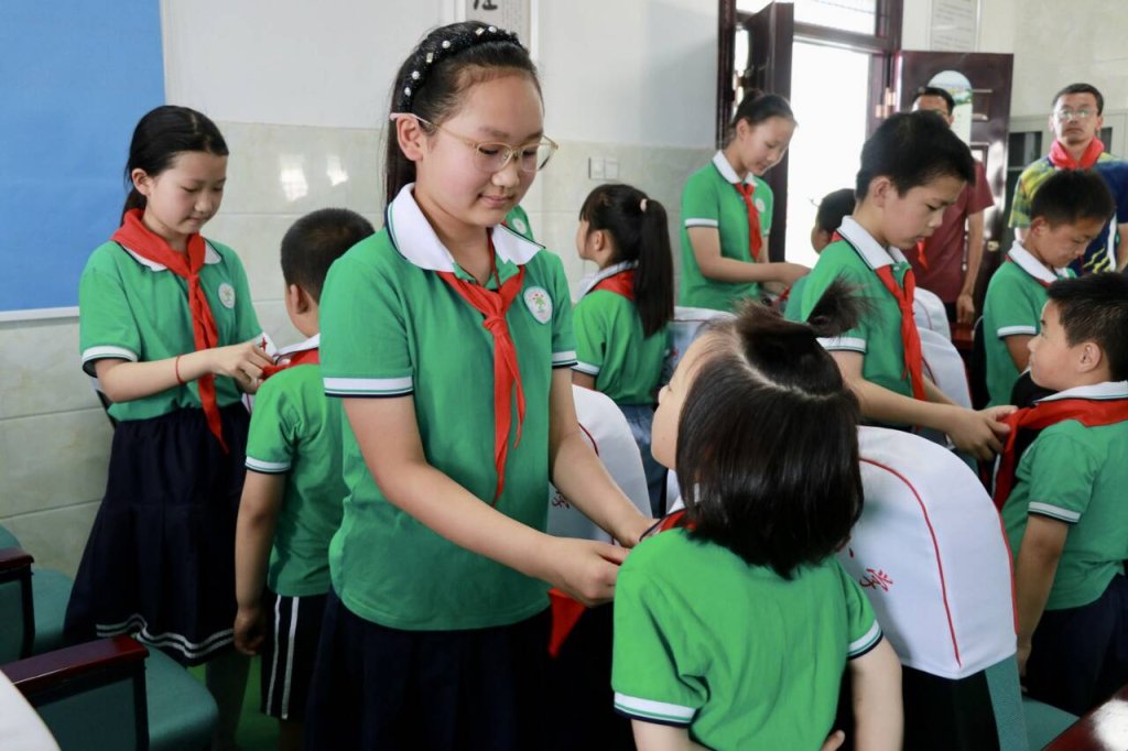 ~ 在入队仪式上,高年级的少先队员为新生佩戴了红领巾,象征着他们正式成为少先队的一员。新生们脸上洋溢着激动和自豪的笑容,他们纷纷表示要珍惜红领巾的荣誉,努力学习,为祖国的繁荣富强贡献自己的力量。