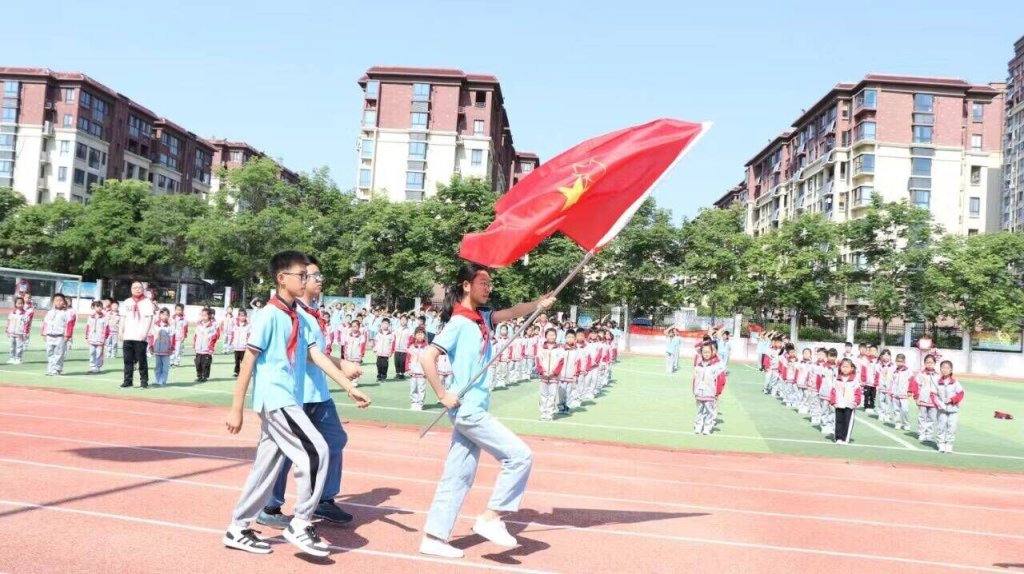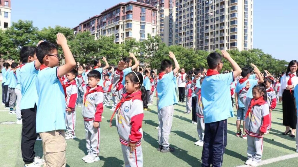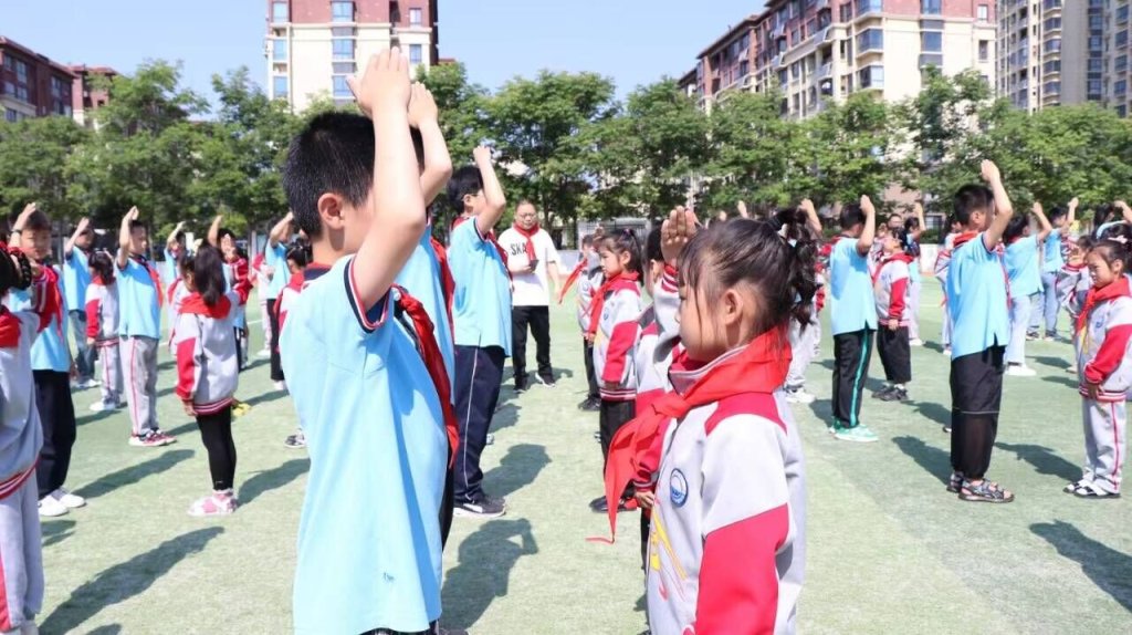 ~ 全体队员行队礼、唱队歌,表达着对党、对祖国、对少先队组织深厚的情感。五年级的老队员们为新队员佩戴红领巾,将红色的责任与使命传递、延续。蔚蓝的天空下,鲜艳的红领巾系着理想,引领我们扬帆远航。