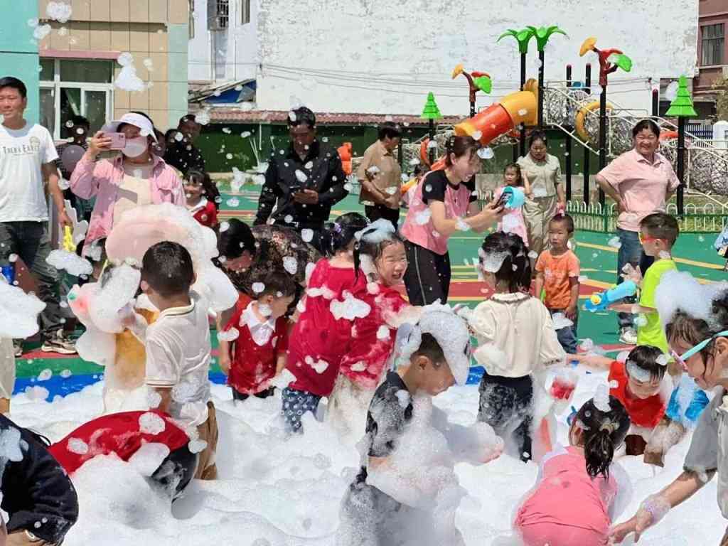 活动一开始,操场上笑声四起、热闹非凡,一条条形态各异的“龙舟”泳池里穿梭着,孩子们的笑声充满着整个校园。在孩子的尖叫声!呐喊声中!水枪和泡沫大战开始了,孩子们、家长们拿起“武器”,装好“子弹”,大家你追我赶,你攻我守,荡漾在友谊的小船上,老师们也加入进来,将整个活动推向高潮,幼儿园变成了欢乐的海洋