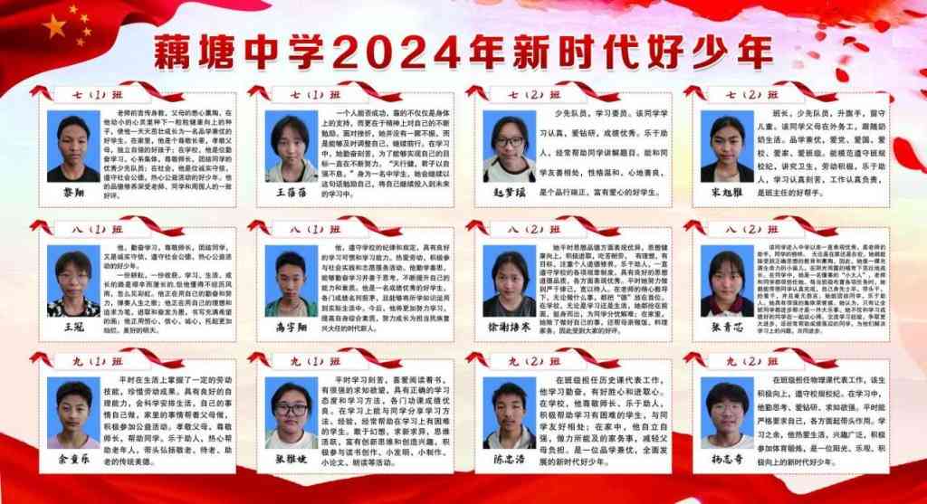 ~ 该校政教处精心组织本次评选活动,要求班主任根据“新时代好少年评选标准”以及学生的突出表现,认真开展评选工作。通过综合考察,该校遴选出12名“藕塘中学2024年新时代好少年”。2024年6月3日,该校对这12名“新时代好少年”进行了表彰,号召全体学生学习他们的先进事迹。