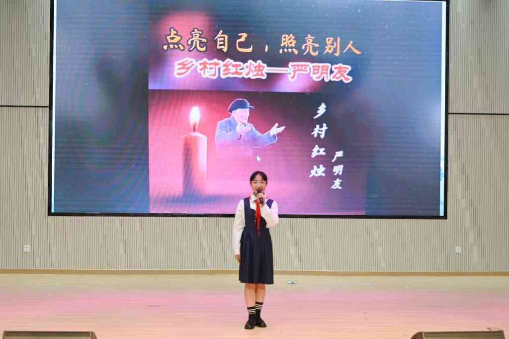 一曲《红星闪闪》拉开了本次思政课的序幕,舞蹈《红色精神 薪火相传》生动再现了战火纷飞的峥嵘岁月和中国共产党人不怕牺牲、英勇斗争的革命精神,深深震撼了现场每一位师生。在第二课时“学习榜样精神,凝聚奋进力量”,实验小学的新时代好少年们用原创快板《少年强国新时代》诠释了当代少年心目中的榜样;《榜样的力量》讲述了中国好人——新四军老战士严明友的感人事迹。第三课时《诗词歌赋里的中华》《强国少年》《盛世中国》,同学们用嘹亮的歌声、铿锵的誓词表达了爱党爱国之情,强烈的民族自豪感油然而生,让人听得热血沸腾又热泪盈眶。