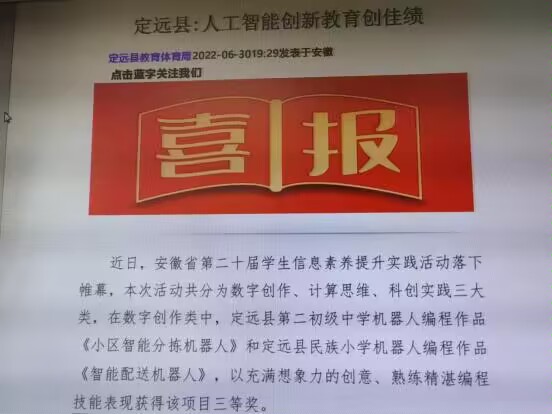 定远县第二初级中学依托人工智能实验室,打造AI创客教育新亮点。该校组建了AI创客小组,由专业的教师团队指导,学生利用人工智能教具和编程工具,进行科技创新实践。通过团队合作,学生们设计了“小区智能分拣机器人”“智能配送机器人”“两轮电动车转向灯自动控制器”“车辆危险倾斜自动预警器”等创新作品,不仅提高了学生的科技创新能力,还激发了学生科技创新的热情。