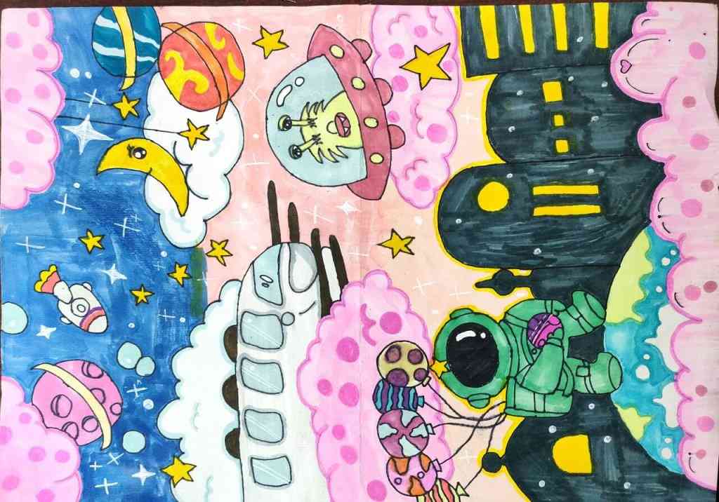 ~ 三、科幻画创作。接下来是科幻画创作环节。学生们拿起画笔,充分发挥自己的想象力和创造力,将心中的科幻世界呈现在画布上。每一幅画都充满了奇幻色彩和创意,让人仿佛置身于未来的科幻世界。