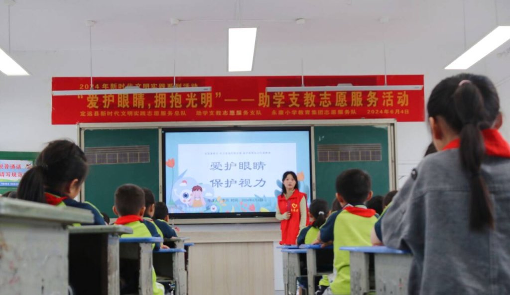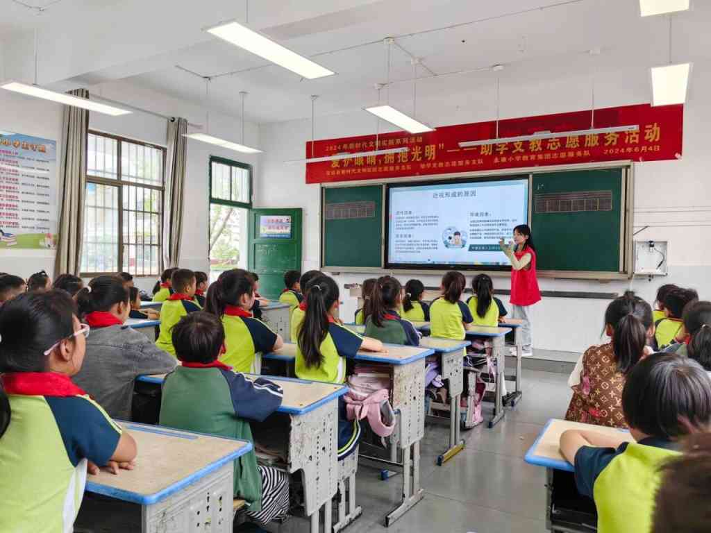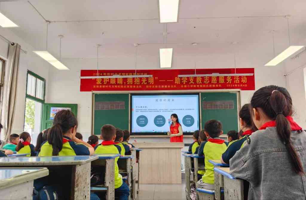 ~ 随着现代社会的发展,学习压力的增大和电子产品的普及,近视问题在青少年中愈发严重。为切实推动“十四五”全国眼健康规划,引导儿童养成科学用眼、细心护眼的良好行为习惯,在第29个全国“爱眼日”到来之际,6月4日上午,定远县永康小学教育集团志愿服务队开展了“爱护眼睛,拥抱光明”全国爱眼日预防青少年近视讲座志愿服务活动,通过活动提高学生对近视问题的认识,传播科学用眼知识,共同守护青少年的明亮双眸。