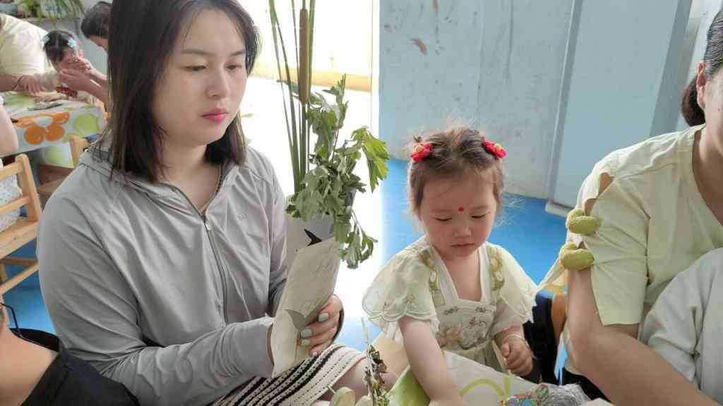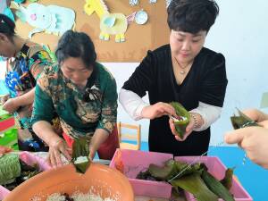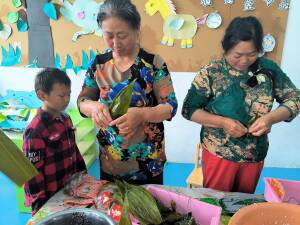 ~ 仓镇中心幼儿园特意邀请了奶奶们妈妈们来和小朋友们一起参加点聪明痣、编手绳、包花、包粽子等活动,她们认真仔细地给小朋友讲解包粽子的每一个步骤。折粽叶、填糯米、加馅料、裹叶子、扎绳等,孩子们好奇地观看着、模仿着。小朋友们看着自己亲手包的粽子,开心极了,整个校园充满了粽子的清香和浓浓的爱意。