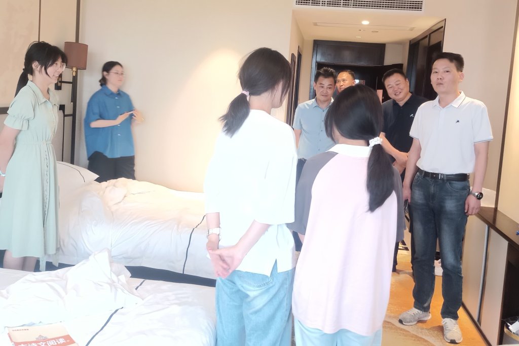 6月13日晚,定远县范岗乡党委书记余飞、乡长徐磊、组织委员吕晨一行到范岗学校中考师生下榻的宾馆看望慰问。