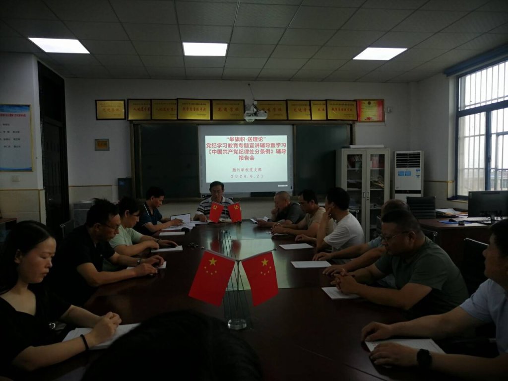 6月21日,定远县胜利学校党支部“举旗帜·送理论”党纪学习教育专题宣讲辅导暨学习《中国共产党纪律处分条例》辅导报告会在该校四楼党建室召开。报告会由该校党支部书记、校长韩有伦主持。