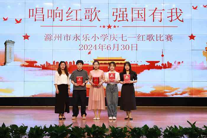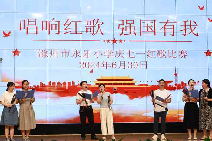 ~ 党旗飘扬指方向,红色歌声更嘹亮。为庆祝中国共产党成立103周年,弘扬党的优良传统,提升教师演唱素养,展示滁州市永乐小学全体教师了解党、热爱党、心向党,以高尚的师德、扎实的工作作⻛、优秀工作业绩向党的生日献礼,6月30日,一场别开生面的教师唱红歌比赛在该校“童乐谷”剧场隆重举行。全体教师用最深情的歌声表达对党和祖国的热爱,将最动听的红歌献给最敬爱的党。