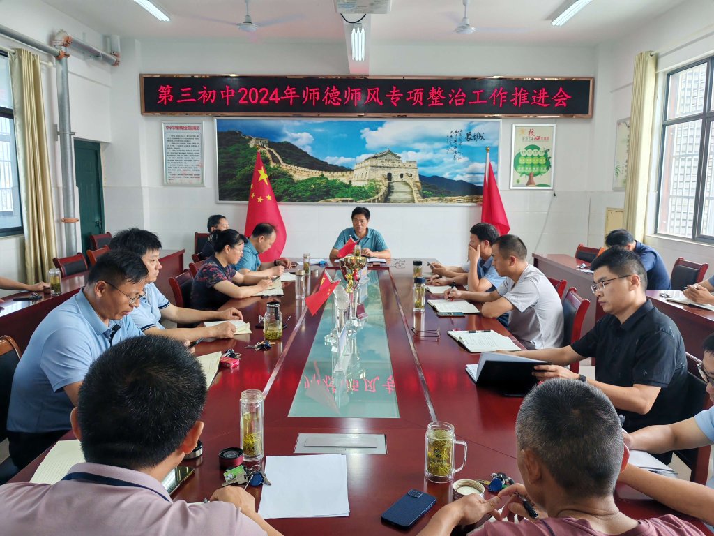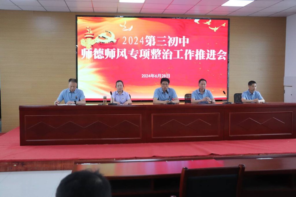 ~ 6月28日、7月5日,第三初中先后组织召开了两次师德师风专项整治行动推进会。该校党支部书记、校长吴传东同志对学校师德师风专项整治三个阶段的工作任务做了进一步安排,明确各个工作组责任,确保师德师风专项整治行动责任到人,任务不落空。要求全体教师对照身边不正之风和腐败问题,严肃认真地开展自查自纠,重点抓好“四查四看”,即查教师违法违纪行为、查教师违规有偿补课行为、查教师违规接受礼金、宴请等行为、查教师体罚、猥亵、性侵、伤害学生及其他师德违规突出问题,逐条对照解决个人在师德方面存在的问题。党员干部、中层领导要做好模范带头作用,以身作则,做好师德师风表率;所有教职员工要防微杜渐,从思想上和行动上加强师德修养,切实履行教师职责,做师德建设的践行者、宣传者、策划者。